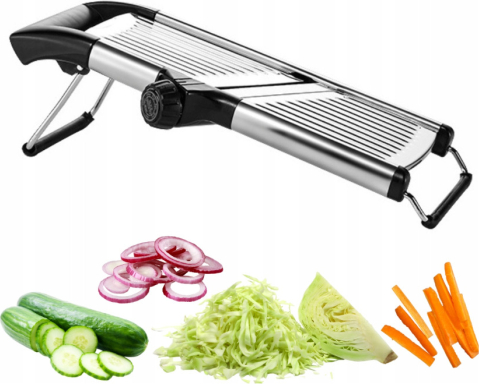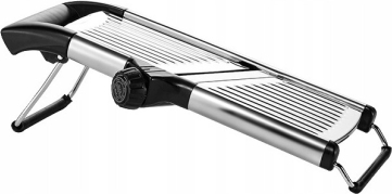 | Daudzfunkcionāla dārzeņu rīve, 3012, Kamille. Izgatavota no nerūsējošā tērauda un izturīgas plastmasas, ar nerūsējošā tērauda asmeņiem. Aprīkota ar trim griešanas asmeņiem: salmiņiem 4,5/9 mm un šķēlītēm 3/6/9 mm. Aprīkota ar neslīdošām kājiņām un ērtu turētāju produktu satveršanai. |