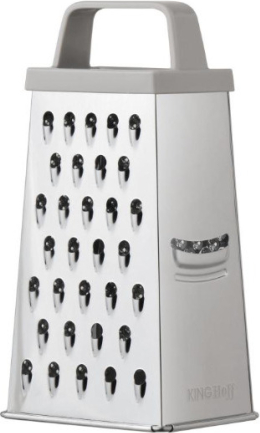 Kinghoff 4-pušu rīve, augstums: 16 cm, KH 1986. 4 funkcionālās rīvēšanas puses – no smalkām līdz rupjām skaidiņām. Izgatavota no augstas kvalitātes nerūsējošā tērauda, izturīga pret rūsu un bojājumiem. Izturīgi un asi asmeņi ātrai un efektīvai rīvēšanai. Ērts plastmasas rokturis drošai un ērtai lietošanai. Stabils dizains atvieglo darbu ar lielāku sastāvdaļu daudzumu. Kompakts izmērs ļauj ērti uzglabāt virtuves skapī vai atvilktnē. Augstums: 16 cm. Pamatne: 8.8 × 6.3 cm. |