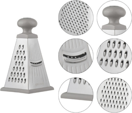 Kinghoff 4-pušu rīve, augstums 21 cm, KH 1988. Izgatavota no augstas kvalitātes nerūsējošā tērauda, izturīga pret koroziju. Četras dažādas rīvēšanas virsmas – no smalkām līdz rupjām skaidiņām. Silikona pamatne aizsargā virsmu un novērš slīdēšanu. Ērts, anatomiski veidots rokturis nodrošina drošu satvērienu. Viegli tīrāma – vienkārši noskalojot zem tekoša ūdens. Izmēri: augstums 21 cm, pamatne 11 × 11 cm. |