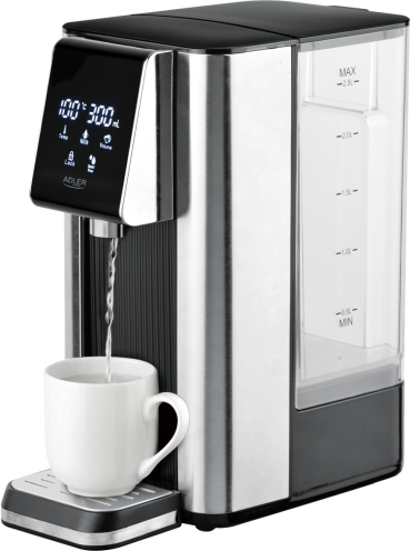 Karstās ūdens dispensers, kas uzvāra ūdeni līdz 100°C 5–10 sekundēs Moderns dizains Maksimālā ietilpība: 2,5 l Minimālā ietilpība: 0,5 l Skārienpanelis Balts LCD displejs ar fona apgaismojumu rāda: Drošības slēdzene/temperatūra/tilpums/piens/start/stop Nerūsējošā tērauda korpuss, nerūsējošā tērauda snīpis 8 dažādi ūdens tilpuma iestatījumi: 000 ml (nepārtraukta ūdens plūsma)/100 ml/150 ml/200 ml/250 ml/300 ml/350 ml/400 ml 7 iepriekš iestatīti temperatūras iestatījumi: 0°C - ūdens netiek uzsildīts, istabas temperatūras ūdens vispārējai lietošanai 45°C - ļoti delikātas tējas, piemēram, japāņu gjokuro 55°C - ūdens želatīna šķīdināšanai 65°C - ziedu tējas, piemēram, jasmīnu 75°C - baltā tēja 85°C – zaļā tēja, viegli grauzdēta kafija 100°C – melnā un ulong tēja, ātri pagatavojamas nūdeles Atsevišķa funkcija ūdens pagatavošanai bērnu maisījumam 40°C Pēdējā iestatījuma atmiņa Noņemama caurspīdīga ūdens tvertne Tīra ūdens filtrs (1 iekļauts) Ūdens līmeņa indikators ar skalu Aizsardzība pret pārkaršanu un izvārīšanos Noņemama nerūsējošā tērauda pilienu paplāte Atkaļķošanas atgādinājums Filtra nomaiņas atgādinājums Jauda: 220-240 V ~50/60 Hz Barošanas vada garums: 100 cm Nominālā jauda: 2200 W Maksimālā jauda: 2600 W Produkta izmēri: 26,3 x 15 x 29,7 cm Produkta svars: 2,45 kg