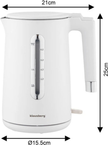| Elektriskā tējkanna Klausberg KB 7890 no nerūsējošā tērauda ar grozāmu pamatni, baltā krāsā, tilpums 1,7 l un jauda 1850–2200 W. 1,7 litru ietilpība ir ideāli piemērota visai ģimenei, ļaujot ātri pagatavot vairākas tasītes tējas, kafijas vai verdošu ūdeni ēdiena gatavošanai, savukārt jaudīgais 1850–2200 W sildelements nodrošina ātru uzvārīšanu pat pilnai tējkannai. Korpuss ir izgatavots no augstas kvalitātes 304 nerūsējošā tērauda un PP plastmasas, nodrošinot izturību un aizsardzību pret koroziju, bet stilīgais matēti baltais dizains ar hroma akcentiem piešķir universālu un elegantu izskatu jebkurai virtuvei. Slēptais plakanais sildelements atvieglo tīrīšanu, uzlabo higiēnu un samazina kaļķakmens veidošanos, bet 360° grozāmā pamatne nodrošina ērtu lietošanu gan labročiem, gan kreiļiem. Snīpis ar filtra sietu efektīvi aiztur nosēdumus un kaļķakmens daļiņas, garantējot tīru ūdeni katrā tasītē, savukārt viegli nolasāmais ūdens līmeņa indikators ļauj ātri pārbaudīt ūdens daudzumu neatverot tējkannu. Ergonomisks rokturis nodrošina drošu un ērtu satvērienu pat pilnai tējkannai, bet klusā darbība padara to par ideālu izvēli mierīgai mājas vai biroja videi. Papildu funkcijas ietver zemu enerģijas patēriņu, automātisku izslēgšanos pēc uzvārīšanas, aizsardzību pret pārkaršanu, termiski izolētu konstrukciju, kas samazina korpusa uzkaršanu un apdegumu risku, kā arī stabilu pamatni drošai novietošanai uz darba virsmas. |