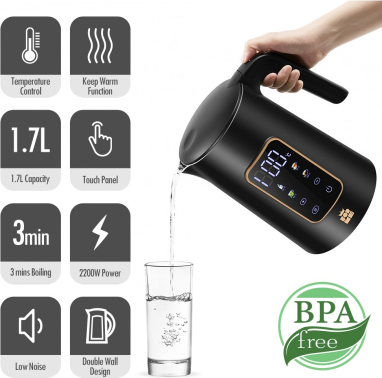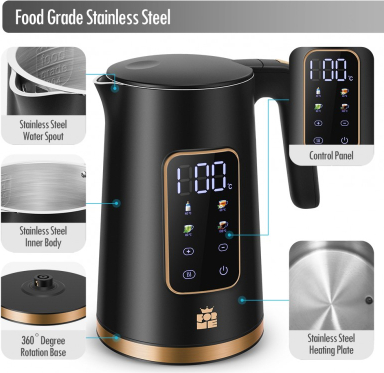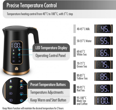 | Liels digitālais temperatūras displejs Četras pogas četrām iepriekš iestatītām temperatūrām Temperatūras izvēle diapazonā no 40 līdz 100 °C ar 5 °C soli Automātiska siltuma uzturēšanas funkcija pēc vārīšanas Automātisks gaidstāves režīms enerģijas taupīšanai Parāda faktisko ūdens temperatūru Slēpts SUS304 nerūsējošā tērauda sildelements Divsienu SUS304 iekšējais slānis ar plastmasas ārējo slāni Tilpums: 1.7l Strāvas padeve: 220-240V 50/60Hz Jauda: 2200 vati |