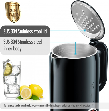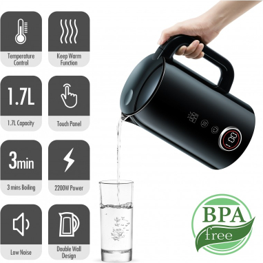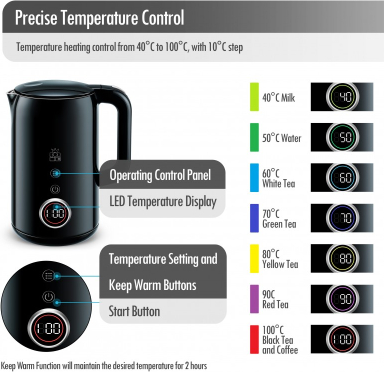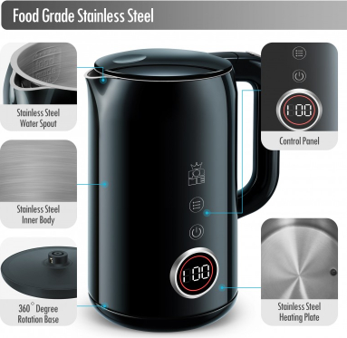 Liels digitālais temperatūras displejs Četras pogas četrām iepriekš iestatītām temperatūrām Temperatūras izvēle diapazonā no 40 līdz 100 °C ar 5 °C soli Automātiska siltuma uzturēšanas funkcija pēc vārīšanas Automātisks gaidstāves režīms enerģijas taupīšanai Parāda faktisko ūdens temperatūru Slēpts SUS304 nerūsējošā tērauda sildelements Divsienu SUS304 iekšējais slānis ar plastmasas ārējo slāni Tilpums: 1.7l Strāvas padeve: 220-240V 50/60Hz Jauda: 2200 vati