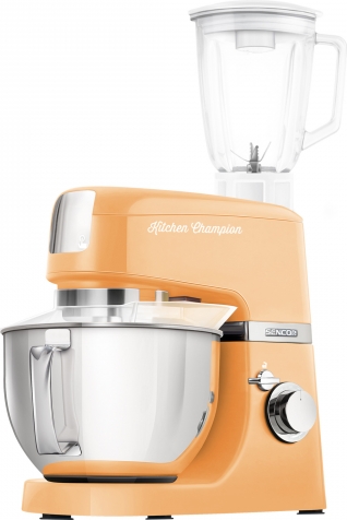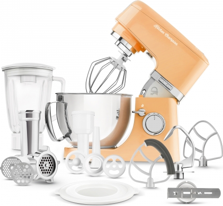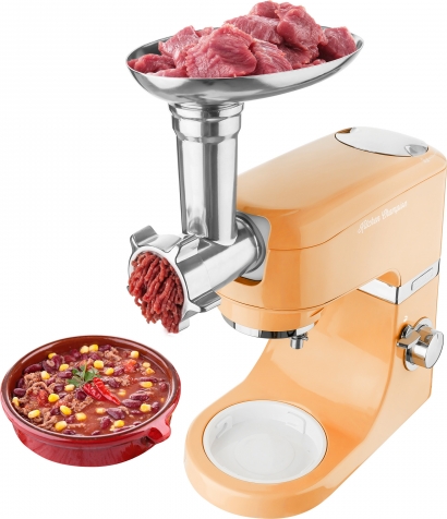 Extremely powerful 1000 W motor with 6 year warranty. Robust full-metal body with metal gears. 3-hub design. Sencor Smart Power & Energy – for optimal speed. LED blending bowl light. Planetary kneading, blending and whipping system - ensures that all the contents in the bowl are completely blended - attachments simultaneously rotate around their own axis as well as around the axis of the gearbox - enables processing 100% of the bowl's contents, guarantees perfect blending of ingredients. Bayonet attachment mounting system enables fast assembly and exchange. Lock-in safety in the top position of the tilt-out arm. Meat grinder for coarse and fine grinding 3 attachments for kneading, beating and light doughs - kneading blade, A-shaped beater, balloon beating whisk. Special FLEXI kneading beater suitable for fine doughs. Sausage stuffer and kebab maker. Cookie maker. Whips up to 8 egg whites. |