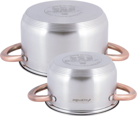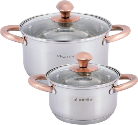 | Katlu komplekts 2 gab. (1.5L, 3.0L), 4935, Kamille. Komplektā ietilpst 4 elementi (1.5L/16×9.5 cm, 3.0L/20×11.5 cm) ar stikla vākiem. Izgatavoti no nerūsējošā tērauda ar dobjiem rokturiem. Katlu iekšpusē ir mērskala. Piemēroti visiem plīts veidiem. |
