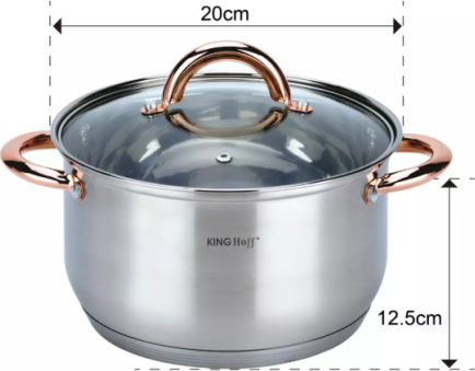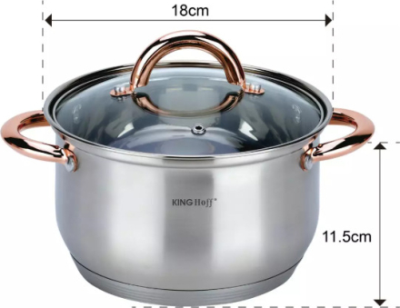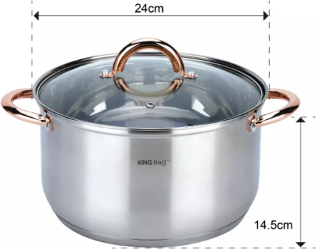 | KINGHoff rozā zelta krāsas katlu komplekts, 6 daļas, Ø18, Ø20, Ø24, KH 1762. Izgatavots no augstas kvalitātes nerūsējošā tērauda. Daudzslāņu termiskais dibens, kas saglabā siltumu. Ēdiens uzsilst ātri un saglabā siltumu ilgu laiku. Piemērots visiem sildīšanas veidiem: gāzes, elektriskajām, keramikas, stikla, halogēna un indukcijas plītīm. Veselīga ēdiena pagatavošana, izmantojot maz ūdens un minimālu tauku daudzumu, samazina vitamīnu, minerālvielu un garšas zudumu. Īpaši piemērots diētiskām ēdienkartēm, kad ēdienus nedrīkst sālīt. Karstumizturīgi rokturi. Pievilcīgs izskats apvienojumā ar praktiskumu. Ēdiena un tauku daļiņas neuzkrājas malu salaiduma vietās. Viegli mazgājams. Piemērots mazgāšanai trauku mazgājamā mašīnā. Komplektā ietilpst: katls ar vāku Ø18 x 11.5 cm 2.9 l. Katls ar vāku Ø20 x 12.5 cm 3.9 l. Katls ar vāku Ø24 x 14.5 cm 6.6 l. |