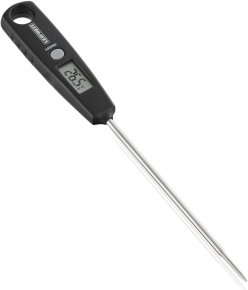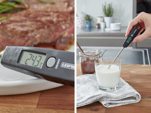 Tagad, dažu sekunžu laikā var uzzināt, vai bērna piens ir pietiekoši silts dzeršanai, vai gaļai ir pareiza iekšējā temperatūra: ar digitālo universālo virtuves termometru no Leifheit. Viegli lietojams termometrs norāda temperatūru īpaši īsā laikā. Vienkārši ielieciet garo nerūsējošā tērauda sensoru vīnā, tējā, ūdenī, pienā vai kūkās, gaļā, un temperatūra tik parādīta. Mērījumu diapazons ir 245 grādi: no -45 līdz + 200°C.