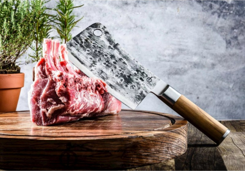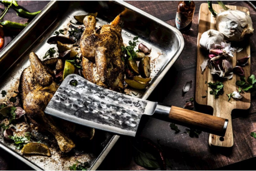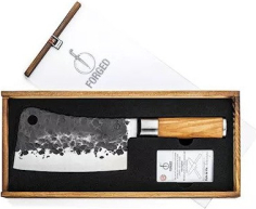 | Šis nazis ir ideāli piemērots lielāku gaļas un dārzeņu gabalu kapāšanai un griešanai šķēlēs. Pateicoties naža svaram un asmeņa leņķim, ar to var viegli sasmalcināt sīkus garšaugus. Kaltie eļļas naži ir izgatavoti no japāņu tērauda 440, un to cietības līmenis ir 58 Rockwell. Visi Forged naži ir izgatavoti ar rokām un tiek pasniegti greznā kastītē. Specifikācijas: Izmēri: 36 x 15,5 x 5 cm Materiāli: olīvkoks, 440C tērauds. Mazgāt tikai ar rokām. |