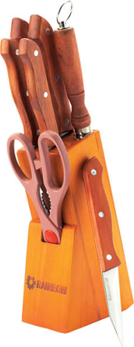| Komplektā 8 piederumi: nažu turētājs, šefpavāra nazis, atkaulošanas nazis, universālais nazis, maizes nazis, dārzeņu nazis un virtuves šķēres, asinātājs
