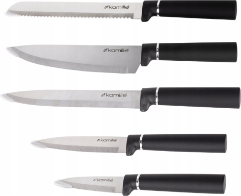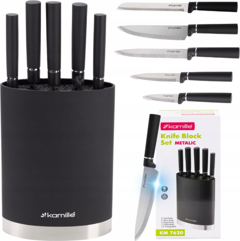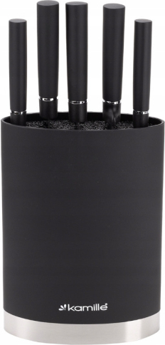 | Nažu komplekts ar statīvu, 6 gab., 7620, Kamille. Komplekts sastāv no 6 daļām (5 naži + statīvs). Naži izgatavoti no nerūsējošā tērauda, bet statīvs – no plastmasas ar pildījumu, kas sastāv no izņemamiem plastmasas stieņiem. Mūsdienīgs un vienkāršs dizains lieliski iederas jebkurā virtuvē. |
