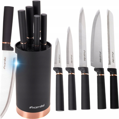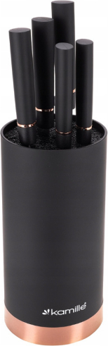 | Nažu komplekts ar statīvu, 6 gab., 7625, Kamille. Komplekts sastāv no 6 daļām (5 naži + statīvs). Naži izgatavoti no nerūsējošā tērauda, bet statīvs – no plastmasas ar pildījumu, kas sastāv no izņemamiem plastmasas stieņiem. Mūsdienīgs un vienkāršs dizains lieliski iederas jebkurā virtuvē. |