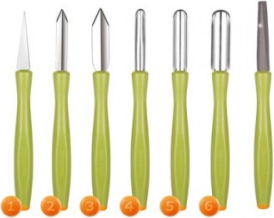 | Universal set excellent for making vegetable and fruit garnishes, suitable for carrot, white radish, radishes, cucumbers, zucchinis, leek, pumpkins, apples, pears, mangos, melons, etc. The set contains 6 special carving knives, ceramic sharpener and box for safe storage. Made of high-grade stainless steel and resistant plastic. Instructions for use enclosed.