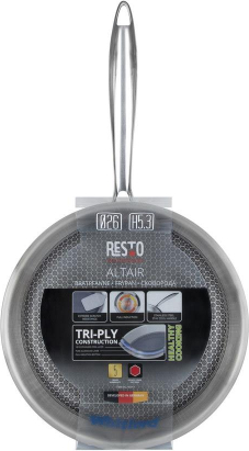 - TRI-PLY (18/10 stainless steel + aluminum + 18/10 stainless steel) - Scratch-resistant honeycomb pattern nonstick surface - Stainless steel stay cool handle - Energy saving 25% - Works on all heating surfaces including induction - Dishwasher safe - Oven-safe up to 220°? Manufacturer Website: https://resto-kitchenware.com/en/series/altair/95012-FRYPAN-O26X50-cm-detail | ||||||||||||||||||||||||||||||||||||||