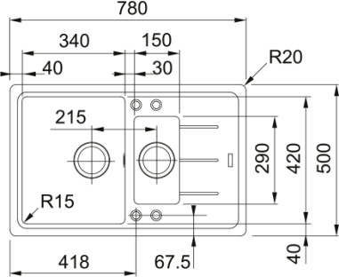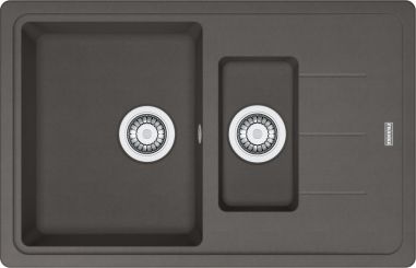Franke virtuves izlietne ar kanalizāciju, izgatavota no granīta, šīfera pelēkas krāsas, ar vienu lielu un vienu mazu bļodu (1,5), virsmas apdare nav. Izlietne ir abpusēji lietojama, ar vienu noteces virsmu un vietu maisītājam. Komplektā ietilpst ventilis ar automātisku pagriešanas pogu, sifons nav iekļauts, maisītāja caurumu skaits – 4 sagataves, ziepju dozatora caurums nav. Izmēri: ārējie 780 x 500 mm; lielās bļodas izmēri 340 x 420 mm, dziļums 200 mm; mazās bļodas izmēri 150 x 290 mm, dziļums 100 mm. Izgriezuma izmēri 760 x 480 mm, minimālais skapja platums 60 cm. Uzstādīšanas veids – ielaidums, ventiļa izvads 3 1/2", noteces virsmas novietojums – atgriezeniskā drenāža. Aktīva vītnes saderība ir jā, piederumu mala abās bļodās nav. |