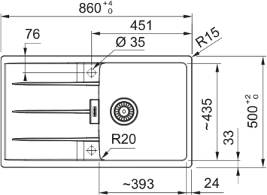 Franke izlietne Centro, izgatavota no granīta, krāsa šīfera pelēks, ar vienu bļodu un iebūvētu kanalizāciju. Virsmas apdare nav klasiska, noteces virsmu skaits 1, izlietne ir abpusēji lietojama. Maisītāja vieta izlietnē paredzēta, ventilis komplektā ar automātisko pagriešanas pogu, sifons nav iekļauts, maisītāja caurumu sagatave 2, ziepju dozatora caurums nav. Ārējie izmēri: platums 860 mm, dziļums 500 mm; bļodas izmēri: 392 x 435 mm, dziļums 200 mm. Izgriezuma izmēri: 840 x 480 mm. Minimālais skapja izmērs 50 cm. Uzstādīšana: ielaidums, ventilis 3 1/2”, noteces virsmas novietojums atgriezeniskā drenāža. EAN/UPC 7612986405415. |