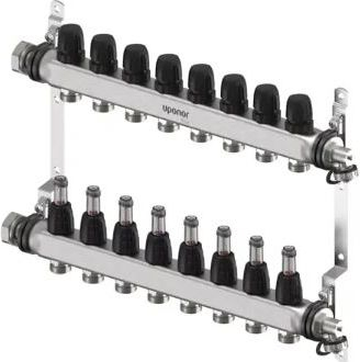 Sadalītājs ar plūsmas mērītājiem balansēšanai un noslēgšanai, pievienojums no labās vai kreisās puses 1''. Piemērots Uponor izpildmehānismiem. Integrētas atgaisošanas atveres un uzpildes un iztukšošanas punkti padevē un atgaitā.