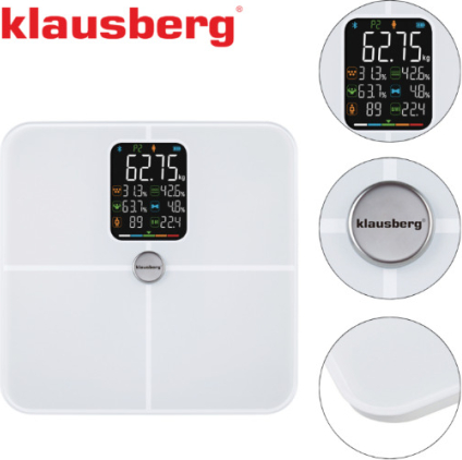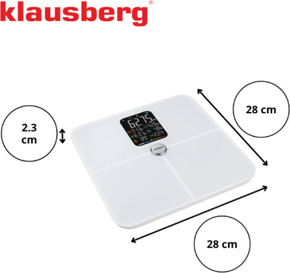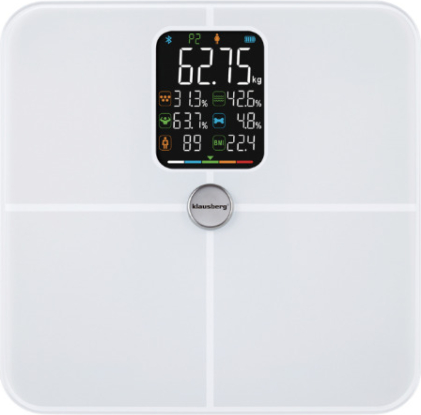 | KLAUSBERG balti vannas istabas svari, 4 × AAA, KB 7941. Galvenās produkta funkcijas: pilna ķermeņa sastāva analīze: tauki, muskuļi, ūdens, kauli, ĶMI, vielmaiņas vecums, ķermeņa vērtējums. Bluetooth + mobilā lietotne (Android/iOS) – mērījumu vēsture, diagrammas, mērķi, pārskati. Vairāku lietotāju atbalsts – ideāli piemērots ģimenēm un mājas sporta zālēm. Celtspēja līdz 180 kg – stabila platforma, kas izgatavota no rūdīta stikla. Mērījumu precizitāte 0,1 kg – reģistrē pat nelielas izmaiņas. Krāsains VA LCD displejs – lieliska nolasāmība un skaidri parametri. Balts, minimālistisks dizains – piemērots modernām vannas istabām. Motivējoša statistika – jūs kontrolējat ne tikai savu svaru, bet arī faktisko ķermeņa sastāvu. Izmēri: 28 × 28 × aptuveni 2,3 cm. |
