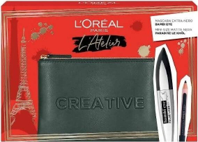 Atelier Kit Set L'Oreal Paris: Bambi Eye, Lash Defining, Mascara, Extra Black, 8.9 ml + Paradise, Kajal Eye Pencil, 1.2 g + Textile Makeup Bag, Black