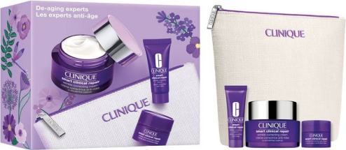 Clinique’s “smart” anti-aging combination includes a serum, eye cream, and anti-wrinkle face cream in full size, all in one luxurious cosmetic bag.