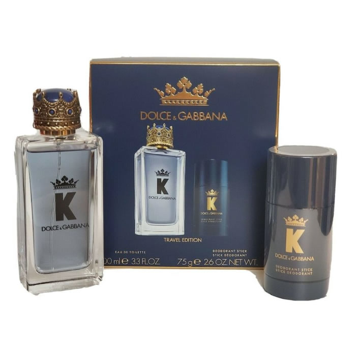 Launch year: 2019. Top notes: Blood orange, Sicilian lemon, Juniper berry. Heart notes: Clary sage, Geranium, Lavandin, Pimento. Base notes: Cedarwood, Vetiver, Patchouli. Design house: Dolce and Gabbana. Series: Dolce & Gabbana K (King). Gender: Mens. Category: Gifts & Sets. Type: Sets. SubType: Gift Set. Barcode: 3423473140252. EDT Spray 3.3 oz, Deodorant Stick 2.6 oz. Dolce & Gabbana K (King) / Dolce and Gabbana Set (m).