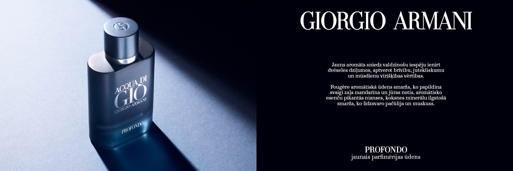 Giorgio Armani Acqua di Giò Profondo tīrs koksnes aromāts, kas veltīts vīrietim un viņa pievilcībai. Kā pievilcīgas harizmas iemiesojums, viņa nepiespiestā elegance pievērš ikviena skatienu. Aromāts, kas ir L'Homme DNA kvintesence, parāda jaudīgu un izsmalcinātu ikoniskā tualetes ūdens interpretāciju. Tas sākas ar svaigu augļu noti un pārtop bagātīgā vērtīgas dzintara koksnes kompozīcijā, pēc tam dodot vietu spēcīgi akcentētam ciedram.
