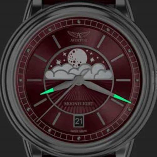 Ciferblatas Tamsoje švytinčios rodyklės, Metalinės valandų padalos, Tamsoje švytinčios rodyklės, Mėnulio fazės indikatorius, Metalinės valandų padalos