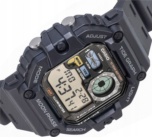 Ypatybės Ličio baterija, kurios ilgaamžiškumas 10 metų, Apšvietimas, Laikmatis, 3 žadintuvai, 24 val. laiko rodymo indikatorius, Potvynių ir atoslūgių grafikas. Grafiškai atvaizduojamas laikrodžio ciferblate. Atvaizduojamas remiantis įvestomis jūsų vietovės koordinatėmis (ilgumą ir platumą) ir laiko tarpu tarp mėnulio įtakojamų potvynių ir atoslūgių, Du laikai, Mėnulio fazės indikatorius, Atgalinis laikmatis