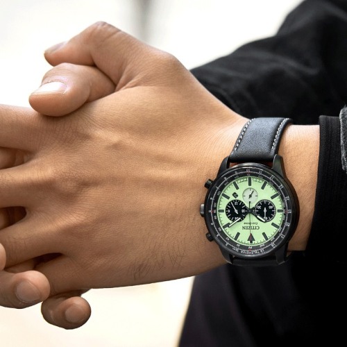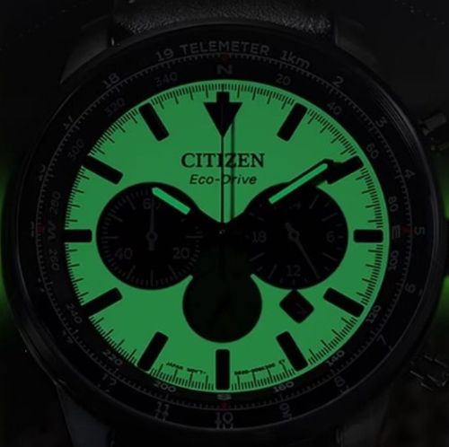Ciferblatas Sekundinė rodyklė atskirame ciferblate virš 6 valandos, Rodyklinis, Metalinės valandų padalos, Tamsoje švytintis ciferblatas, Chronometras, Tamsoje švytinčios rodyklės, Tachometras (greičio indikatorius)