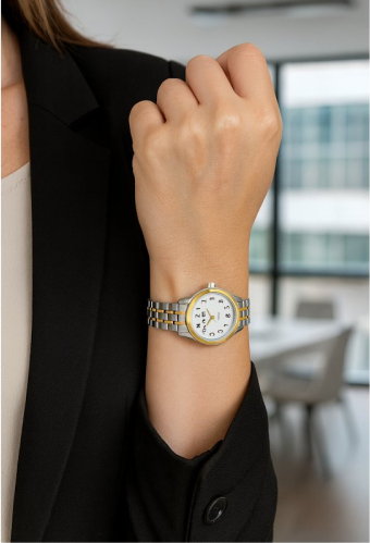 Korpuso spalva ir papuošimai Pastaba: šio laikrodžio korpusas padengtas aukso imitacija, Paauksuotas, Įvairiaspalvis, Plieno spalvos