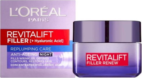 L’Oréal Paris Revitalift Filler Hyaluronic Acid Night Cream 50 ml ir pretgrumbu nakts krēms ar augstu hialuronskābes koncentrāciju, kas paredzēts intensīvai ādas mitrināšanai un atjaunošanai nakts laikā. Formula palīdz piepildīt grumbas ar mitrumu, uzlabot ādas elastību un atjaunot sejas kontūras, padarot ādu gludāku un tvirtāku. Krēms satur arī augu ekstraktus, kas palīdz stiprināt ādu un uzlabot tās struktūru. Nakts laikā tas dziļi mitrina ādu, samazina sausuma pazīmes un veicina svaigāku, jauneklīgāku izskatu jau no rīta.