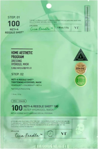 VT COSMETICS RETI-A Reedle Shot 100 2Step Hydrogel Mask ir radīta cilvēkam, kurš vēlas intensīvi atjaunotu, elastīgu un mirdzošu ādu. Tā palīdz stiprināt ādas struktūru, samazināt novecošanās pazīmes un uzlabot ādas toni, vienlaikus nodrošinot mitrināšanu un nomierināšanu. Masku var lietot kā īpašu kopšanas procedūru, lai iegūtu “glassy skin” efektu un veselīgu, starojošu sejas izskatu.
