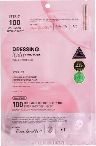 VT COSMETICS Collagen Reedle Shot 100 2Step Hydrogel Mask (1,5 g + 33 g) ir divpakāpju hidrogēla maska, kas paredzēta intensīvai mitrināšanai, elastības uzlabošanai un ādas atjaunošanai. Tā formula satur hidrolizētu kolagēnu, kas palīdz stiprināt ādas struktūru un uzlabot elastību, kā arī Cica Reedle™ mikrospikulas, kas palīdz aktīvo sastāvdaļu dziļākai uzsūkšanās ādā. Maskas sastāvā ir arī hialuronskābe, peptīdi un augu ekstrakti (piemēram, kumelīte un centella asiatica), kas nodrošina mitrināšanu, nomierināšanu un antioksidantu aizsardzību. Maskas divpakāpju sistēma nodrošina optimālu aktīvo vielu piegādi un ilgstošu efektu, atstājot ādu gludu, elastīgu un starojošu.