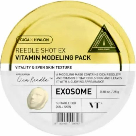 VT COSMETICS Reedle Shot EX Vitamin Modeling Pack 25 g ir modelējoša (algināta/peel-off) sejas maska, kas paredzēta ādas izgaismošanai, mitrināšanai un tekstūras uzlabošanai. Tās formula satur Cica Reedle™ mikrospikulas, kas palīdz uzlabot aktīvo vielu uzsūkšanos ādā, kā arī C vitamīnu, kas palīdz izgaismot ādu un izlīdzināt tās toni. Sastāvā ir arī piena eksosomas, kas palīdz mitrināt un stiprināt ādas barjeru, kā arī diatomīta (diatomaceous earth) un mālu komponenti, kas palīdz attīrīt ādu un absorbēt netīrumus. Maska nodrošina dziļu kopšanu, mirdzumu un gludāku ādas izskatu.