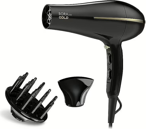 komplektācija Bora Gold Ion matu fēns, koncentrētas gaisa plūsmas uzgalis, difuzors