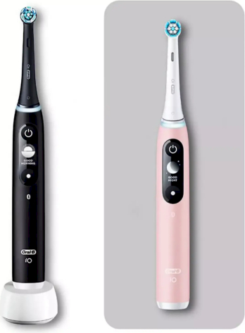 Oral‑B iO Series 6 Duo elektrisko zobu birstu komplekts (2 gab.) — moderns komplekts pieaugušajiem ar divām elektriskajām birstēm krāsu kombinācijā Black Lava + Pink Sand (melns un rozā). Abas birstes izmanto magnētisko iO tīrīšanas tehnoloģiju ar mikro‑vibrācijām un apaļām galviņām, nodrošinot dziļu un saudzīgu aplikuma noņemšanu un smaganu kopšanu. Katra birste aprīkota ar interaktīvu displeju un spiediena sensoru, kas brīdina par pārāk lielu spiedienu, palīdzot pasargāt smaganas un emalju. Bluetooth savienojums ar lietotni Oral‑B ļauj sekot tīrīšanas ieradumiem un saņemt personalizētus padomus. Komplekts piedāvā 5 viedos tīrīšanas režīmus un iebūvētu 2 minūšu taimeri ar 30 sekundžu pauzēm, lai nodrošinātu pilnīgu mutes dobuma apstrādi. Komplektā ir 2 rokturi birstēm, 2 maināmās galviņas, lādētājs un futlāris, kas ērtai lietošanai mājās un ceļojumos. Krāsas: