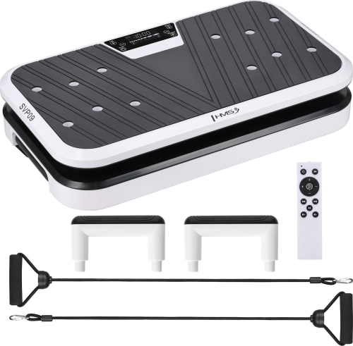 SVP09 VIBRATION PLATFORM WITH PUSH UP BARS HMS The SVP09 vibration platform from HMS Fitness is a modern training device that allows you to effectively strengthen muscles, improve fitness, and diversify daily workouts – without leaving home. Thanks to wide adjustment options and rich equipment, it is suitable for both beginners and advanced users. Effective up-and-down vibration training The SVP09 vibration platform operates in an up-and-down axis, generating intensive vibrations that activate deep muscle groups. The speed range from 1 to 120 levels allows precise adjustment of training intensity to individual needs – from light activation to demanding strength and conditioning workouts. The vibration amplitude ranging from 1 cm to 2.8 cm further increases exercise effectiveness. Training programs and time adjustment The SVP09 is equipped with 5 preset training programs that support various goals such as fat reduction, improved circulation, or muscle strengthening. Users can also manually set the training time from 1 to 20 minutes, allowing the session to be perfectly adjusted to their daily schedule. Exercise versatility – resistance bands and push-up handles The platform comes with resistance bands, enabling simultaneous training of upper and lower body parts. An additional advantage is the push-up handles, which can be positioned in multiple configurations, significantly increasing the range of possible exercises and allowing for comprehensive full-body workouts on a single vibration platform. Bluetooth, music, and convenient control The SVP09 platform features a Bluetooth module, allowing you to listen to your favorite music directly from the device during training. An intuitive control panel and the included remote control ensure comfortable operation without bending down or interrupting your workout. Safety and solid construction The solid construction of the HMS Fitness vibration platform guarantees stability and safe use. A maximum user weight of up to 150 kg makes the SVP09 suitable for a wide range of users, both women and men. Why choose the SVP09 HMS Fitness vibration platform? The SVP09 training platform combines modern technology, functionality, and user comfort. Ideal for home workouts, rehabilitation, warm-ups, and muscle recovery. It is a versatile fitness device that helps you achieve better results faster and more effectively.