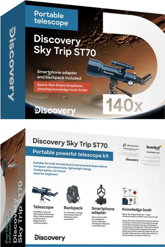 Discovery Channel informē, izklaidē un iedvesmo skatītājus visā pasaulē par pasauli visā tās brīnumainībā, daudzveidībā un pārsteigumā. Piedāvājot miljoniem cilvēku iespēju atklāt un apmierināt savu zinātkāri, Discovery piedāvā aizraujošu dažādu žanru stāstu apvienojumu, tostarp zinātnes un tehnoloģiju, izpētes, piedzīvojumu, vēstures un padziļinātu ieskatu aizkulisēs par cilvēkiem, vietām un organizācijām, kas veido un veido pasauli, kurā mēs dzīvojam. Mēs ar lepnumu iepazīstinām ar Discovery optikas sēriju, ko ražo Levenhuk un atbalsta Discovery. Discovery Sky Trip ST70 ar grāmatu ir īpaši kompakts refraktora teleskops, kas ir ideāli piemērots, lai jūs varētu no pirmavota vērot kosmosu. No grāmatas "Space. Ne tukšums" zināšanu grāmata iesācēji-astronomi uzzinās aizraujošu informāciju par zvaigžņu vērošanu un uzreiz liks savas zināšanas lietā. Jūs varat pētīt Mēnesi un planētas, kā arī Zemes ainavas, izmantojot šo instrumentu kā jaudīgu tālskati. Novērotājiem būs redzami pat spilgtākie debesu dziļuma objekti. Discovery Sky Trip ST70 ir viegli lietojams: optiskā caurule ir uzstādīta uz alt-azimuta stiprinājuma, kas ļauj pārvietot cauruli uz augšu un uz leju un no kreisās puses uz labo. Teleskopam ir daudz piederumu: Barlow objektīvs, dažādu fokusa attālumu okulāri, optiskais meklētājs, diagonālā prizma un adapteris viedtālrunim. Varat regulēt palielinājumus, lai izpētītu kosmosa skaistumu, un fotografēt, lai iemūžinātu savu novērojumu rezultātus. Augstumu regulējams alumīnija statīvs viegli pielāgojas jūsu augumam. Atšķirībā no citiem refraktoriem Discovery Sky Trip ST70 izdodas izcelties, pateicoties mazajam optiskās caurules izmēram. Salīdzinot ar citiem līdzīgiem modeļiem, caurule ir uz pusi īsāka nekā daudziem citiem. Tāpēc teleskops ir viegli transportējams; to var ņemt līdzi pat ceļojumā. Komplektā ietilpst speciāla mugursoma drošai transportēšanai un daudzi citi piederumi. Vēl viena priekšrocība ceļotājiem: ātra un vienkārša uzstādīšana. Galvenās funkcijas:
