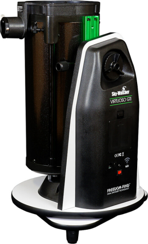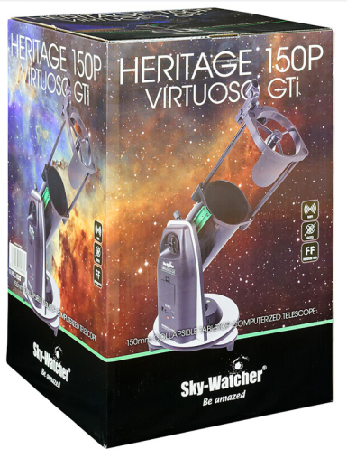 Īsumā par priekšrocībām: relatīvi augsta gaismas savākšanas jauda, pateicoties 150 mm apertūrai; izturība pret vibrāciju un vēju, pateicoties kompaktajam dizainam; difrakcijas ierobežota paraboliskā primārā spogule; augsta kontrasta attēls, pateicoties plānām sekundārā spoguļa zirnekļa lāpstiņām; pārnēsājams un ātri saliekams; ekspozīcijas laiks astrofotogrāfijai, pateicoties īsajam fokusa attālumam; FlexTube™ sistēma: pateicoties saliekamajai caurulei, teleskopu ir ļoti viegli transportēt, un tas dienas laikā aizņem ļoti maz vietas. Virtuoso GTI stiprinājums pagriežas uz izvēlētajiem objektiem un vada teleskopu. Stiprinājums izveido savu WLAN, caur kuru var bezvadu režīmā savienot viedtālruni. Bezmaksas SynScan lietotne operētājsistēmām iOS un Android ļauj inicializēt un vadīt stiprinājumu. Kad lietotne ir instalēta viedtālrunī, vairs nav nepieciešama piekļuve internetam, lai to kontrolētu. Citas funkcijas: Freedom-Find™ divkāršais kodētājs: varat manuāli pārvietot teleskopu, nezaudējot iepriekš saglabāto pozīcijas informāciju. Tas ļauj pagriezt teleskopu, neizmantojot motorus. Tas ir ātri un ietaupa enerģiju. Galda statīvam apakšpusē ir 3/8 collu foto vītne, lai to varētu tieši piestiprināt pie statīva. Pamatnes diametrs ir 330 milimetri. Teleskopa caurule tiek piestiprināta, izmantojot Vixen prizmas sliedi. Var piestiprināt arī citas optikas, ja tām ir šāda veida prizmas sliede. Komplektā iekļautie piederumi: 1,25 collu okulāri 25 mm, 10 mm Meklētāja teleskops Sarkanā punkta meklētājs Nēsāšanas rokturis jā Kolimācijas palīglīdzeklis Okulārs Bateriju nodalījums jā |