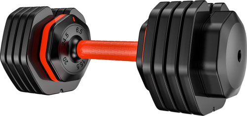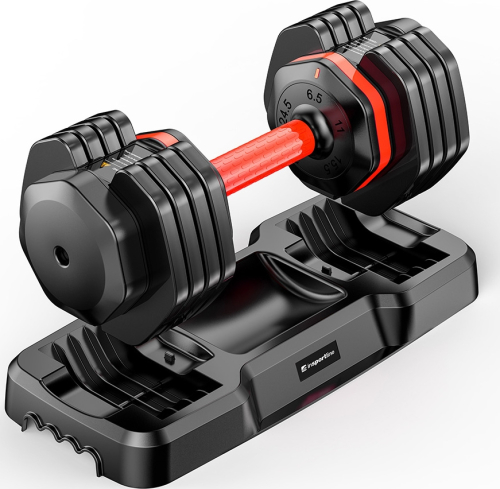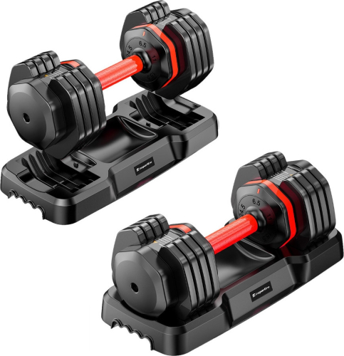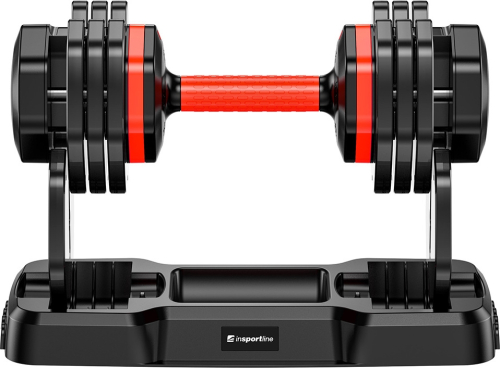 The Adjustable Single-Handed Dumbbells inSPORTline DuraBell® are made for your gym! With a unique weight adjustment system, they require just one turn of the shaft on each dumbbell, and you’re ready to go! When you hear a click it means that the selected weight has been locked in place. The weight in kilograms can be seen on the inside of the dumbbell. Each side of the dumbbell can hold as many as 4 weights, which means that one dumbbell can weigh from 6.5 to 24.5 kg, which is more than enough for an at-home workout, particularly arm-strengthening exercises. However, the dumbbells can also help you strengthen your abs and pecs. Thanks to the adjustable weight, the dumbbells can be used by multiple users, regardless of their physical fitness. The solid, rubber-coated handle features non-slip ribbing for a perfect grip. The dumbbells come with two plastic stands that are big enough to hold both the dumbbell and the weights. Therefore, you won’t have to worry about your dumbbells or weights rolling away when you put them on the floor. If you’re looking to push yourself to the limit without having to worry about anything else, then this cost-effective set is the clear choice! | ||||||||||