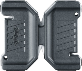| • 2 different cutting angles. For example, 17° for kitchen knives and 25° for hunting and outdoor knives.• 2 different sharpening inserts: The carbide inserts in the coarse, dark notch are for basic sharpening. The ceramic inserts in the fine, white notch are for polishing the blade and restoring it to its original shine. • Hold the knife sharpener in the ribbed area with your left hand and press it onto a firm surface where it won’t slip. Draw the knife through the sharpener three or four times without applying force. It will then be ready to use again.• Not suitable for serrated, jagged or damaged knives! | ||||||||||||