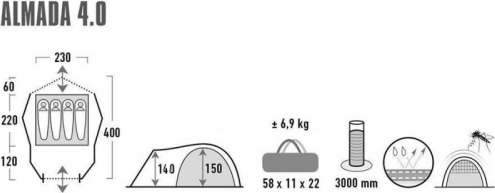 | Telts High Peak Almada 4 gaiši pelēka 11571 4-vietīga High Peak telts no augstas kvalitātes materiāla ar augstu ūdensizturību, ar līmlentām šuvēm. Dubultā apvalka konstrukcija. Gaisa plūsma starp guļamistabas sienām un tropiem neļauj guļamistabā sasalst. Vario Vent Control tehnoloģija. Zema ventilācijas atvere Stikla šķiedras rāmis ir izturīgs un ļoti ātri atlokās un salokāms. Lampas turētājs. Kabatas ērtai organizēšanai. Lieta. Tehniskie dati: cilvēku skaits: 4 ūdensizturība: 3000 mm ūdens stabs UV aizsardzība: UPF 80+ loksne: 100% poliesters, PU, līmētas šuves Guļamistaba: 100% elpojošs poliesters, ieeja - siets grīda: 100% polietilēns (PE) rāmis: stikla šķiedra 9,5 mm izmēri: 230x400 (220 cm guļamistaba + vestibili 60 cm un 120 cm) augstums: guļamistaba 150 cm, vestibils: 140 cm izmēri pēc salocīšanas: 58x11x22 cm svars: 6,9 kg |
