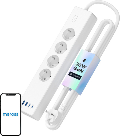 Meross MSP844(EU) smart fast charging power strip, 4 outlets + 2x USB-A + 2x USB-C (Matter)Meross MSP844(EU) is an advanced power strip with four outlets and four USB ports (2× USB-A, 2× USB-C), which combines the functions of charger, extender and intelligent power management. With support for the Matter standard, it integrates seamlessly into popular smart home ecosystems. Independent control of the outlets and USB group, fast charging and extensive security features make it the perfect solution for any modern home.