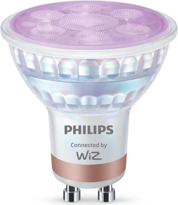 Philips WiZ GU10 smart bulb fits any standard spotlight and offers dimmable tunable white and full-color lighting. Its elegant glass body and Wi-Fi-based control make it a seamless, hub-free smart lighting solution.