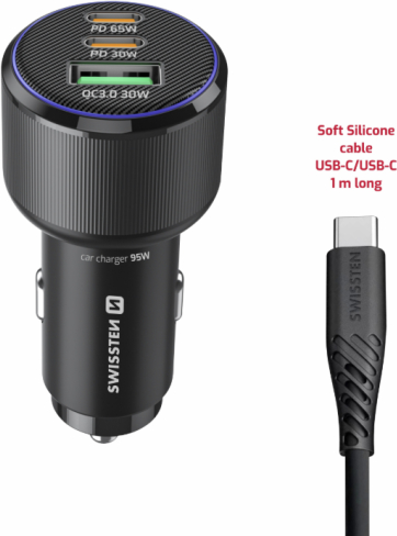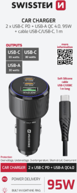 Profesionāls automašīnas lādētājs ar PD 3.0 un QC 4.0 atbalstu, kas paredzēts klēpjdatoru, planšetdatoru un viedtālruņu ātrai uzlādēšanai. Kopējā jauda līdz 95 W viegli uzlādē pat jaudīgas ierīces braukšanas laikā. Komplektā ietilpst 1 m USB-C/USB-C kabelis (3A, 60 W, mīksts silikons). Zils LED gredzens atvieglo kabeļu pievienošanu pat tumsā.