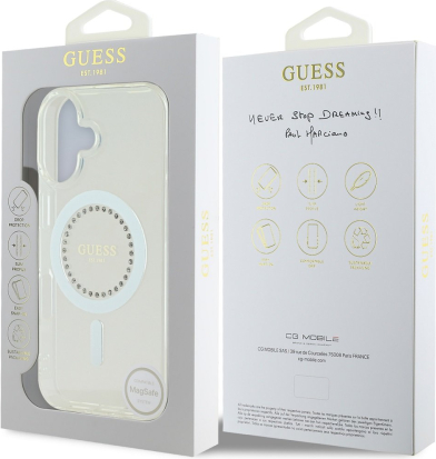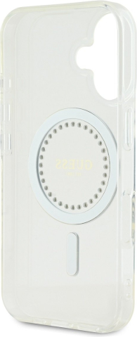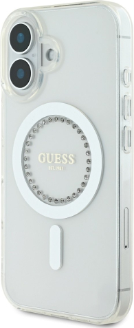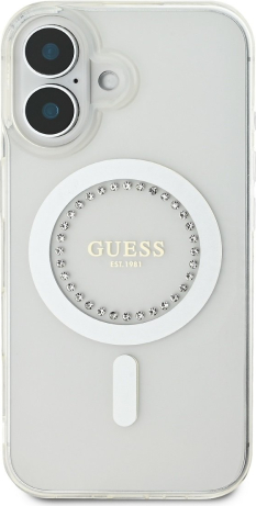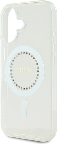 Guess IML Rhinestones Ring MagSafe Case Aizsargapvalks priekš iPhone 16 / balts
