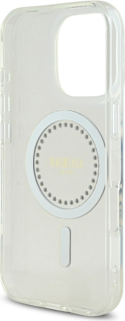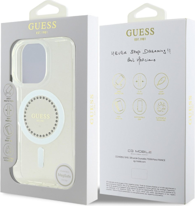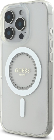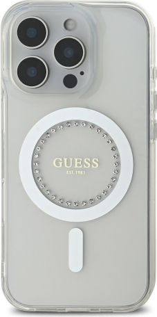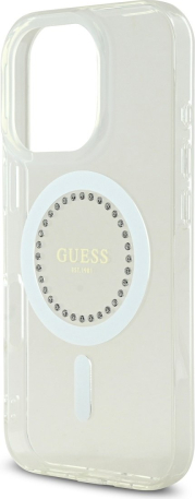 Guess IML Rhinestones Ring MagSafe Case Aizsargapvalks priekš iPhone 16 Pro / balts