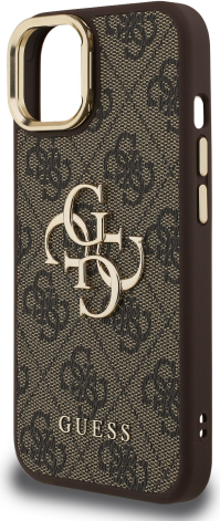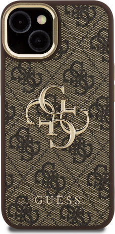 Guess PU 4G Metal Logo Stand Camera Frame Case Aizsargapvalks priekš iPhone 13 / brūns