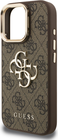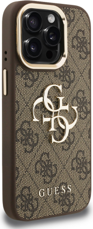 Guess PU 4G Metal Logo Stand Camera Frame Case Aizsargapvalks priekš iPhone 15 Pro Max / brūns
