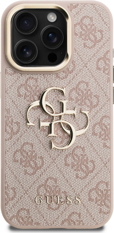 Guess PU 4G Metal Logo Stand Camera Frame Case Aizsargapvalks priekš iPhone 15 Pro / rozā
