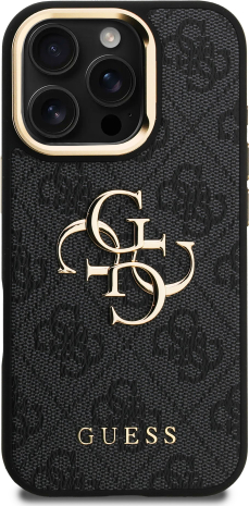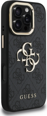 Guess PU 4G Metal Logo Stand Camera Frame Case Aizsargapvalks priekš iPhone 16 Pro / melns